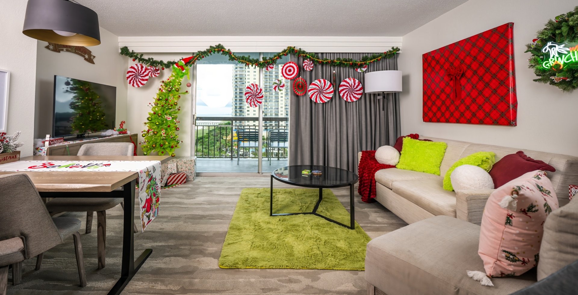 Make your holiday stay unforgettable in our Humbug Suite at Embassy Suites, available November 28 through January 3. This whimsically decorated double queen room brings playful green holiday cheer to life, complete with a welcome treat, a $10 credit to the Christmas Village Bar, and a special take-home holiday gift.