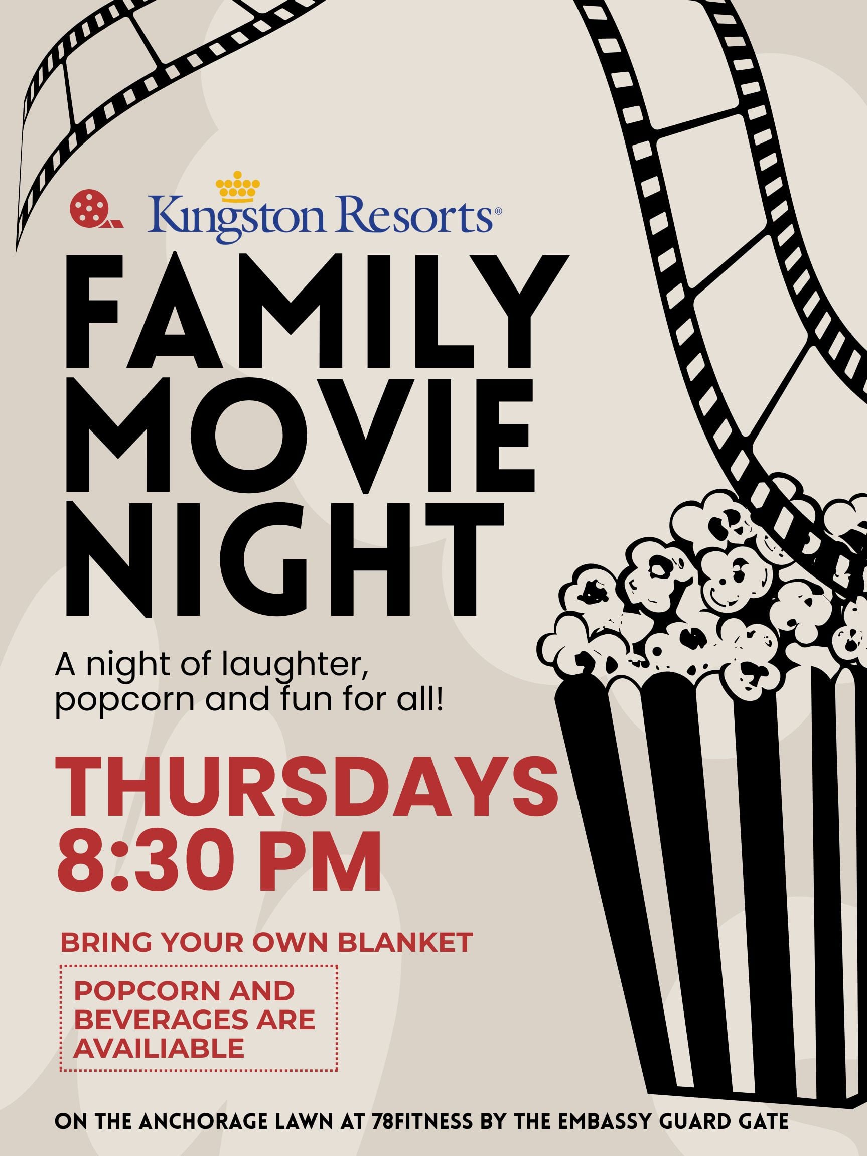 Join us every Thursday at 8:30pm as the sun sets for movie night under the stars! This is a free event for all guests of Kingston Resorts featuring a new movie each week.