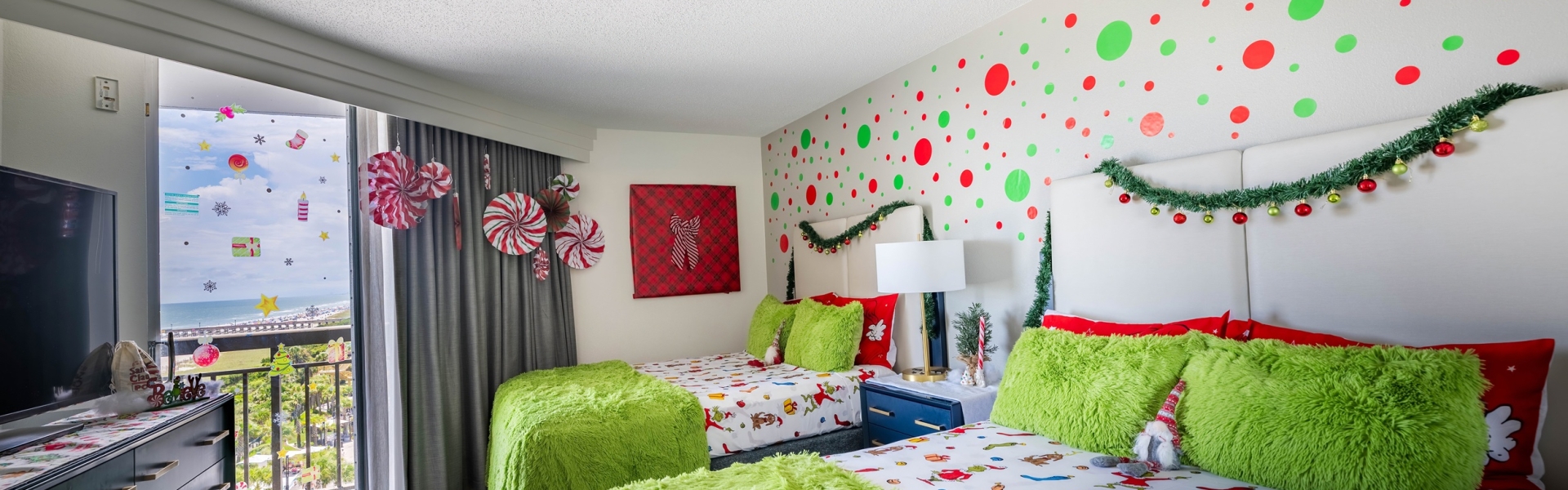Make your holiday stay unforgettable in our Humbug Suite at Embassy Suites, available November 28 through January 3. This whimsically decorated double queen room brings playful green holiday cheer to life, complete with a welcome treat, a $10 credit to the Christmas Village Bar, and a special take-home holiday gift.